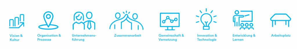 Die erste Dimension ist die Vision & Kultur eines Unternehmens. In einem Satz geht es darum, dass die alten, gewohnten Strukturen von Unternehmen aufgebrochen werden und sich neue Ansätze etablieren. Diese Dimension erfordert ein Umdenken von Führungspersonen, aber auch von Mitarbeiter*Innen in Unternehmen. Haltung, Sinn und Purpose sind drei wichtige Begriffe, die eng mit den Themen Vision & Kultur verbunden sind.