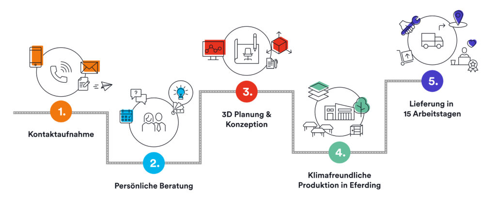 Unser Anspruch bei hali ist es, deine Bedürfnisse kennenzulernen, damit wir eine individuelle Office-Lösung planen und fertigen können, die perfekt auf dich zugeschnitten ist. Mit unserer Büromöbelberatung und Planung bist du bei unseren Expert*innen in besten Händen, vom ersten Kontakt, über die Beratung, 3D Planung und Konzeption bis hin zur klimafreundlichen Produktion in Eferding und der Lieferung in 15 Arbeitstagen.