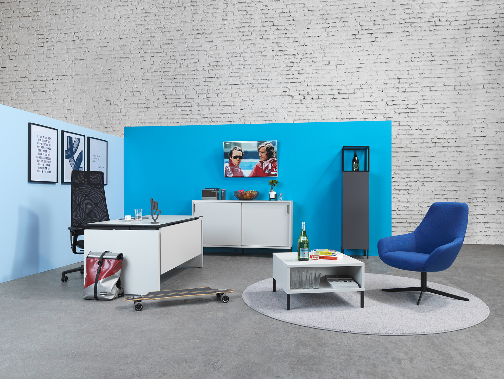 Homeoffice-Bereich mit Sitzhocker Bully, Schreibtisch und Skateboard vor blauer Wand