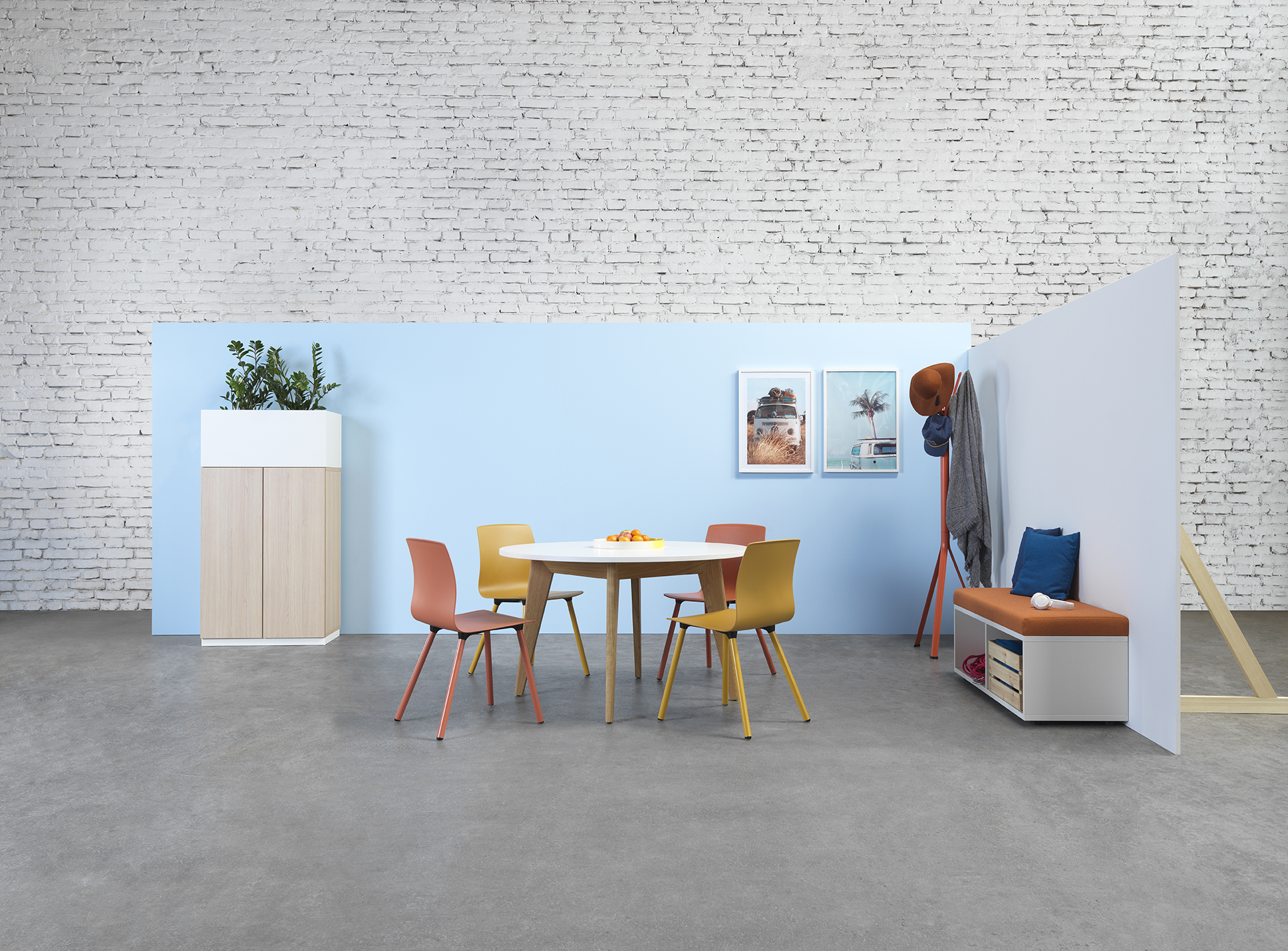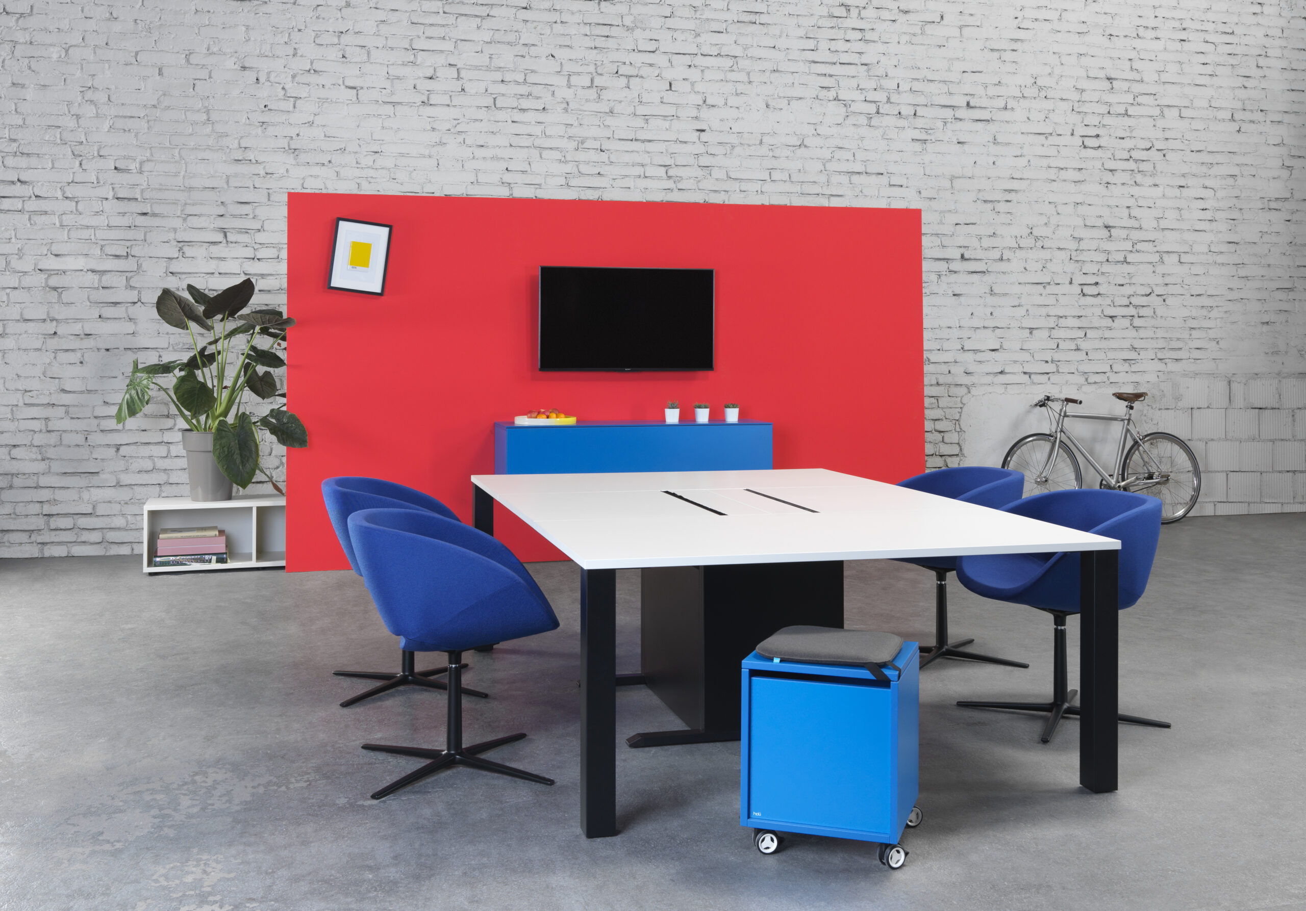 Flexible Bürolandschaft mit s440 Arbeitstisch, Stauraumvarianten und mobilen Bully-Hockern