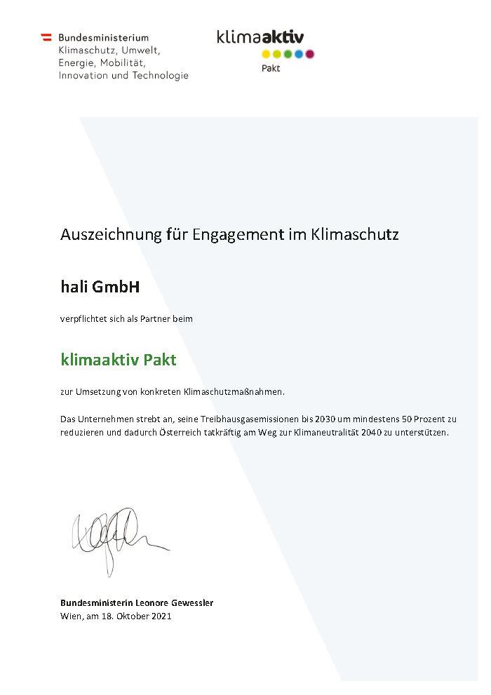 Zwölf renommierte österreichische Vorzeige- unternehmen sind Teil des klimaaktiv Pakts. hali hat sich ebenfalls den Maßnahmen für den Klimaschutz verpflichtet und ist das einzige Unternehmen der Büromöbelbranche, das sich dem Pakt verpflichtet hat. Damit fördert hali aber nicht nur Nachhaltigkeit bei Büromöbeln, sondern trägt auch in anderen Bereichen zu mehr Nachhaltigkeit bei.