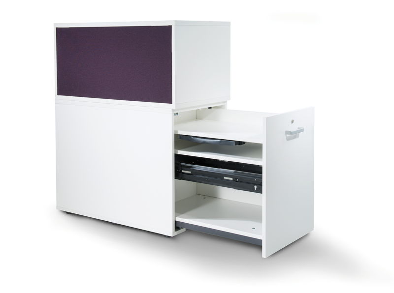 Der melaminbeschichtete Korpus lässt sich optional mit Steckdosenmodul, Stoffrückwand oder Verschlussfach erweitern – und passt sich so deinem Arbeitsstil an. Mit seiner niedrigen Höhe ist der Apothekerschrank ideal als Unterbau und in Kombination mit dem Aufsatzregal auch als Raumtrenner nutzbar.