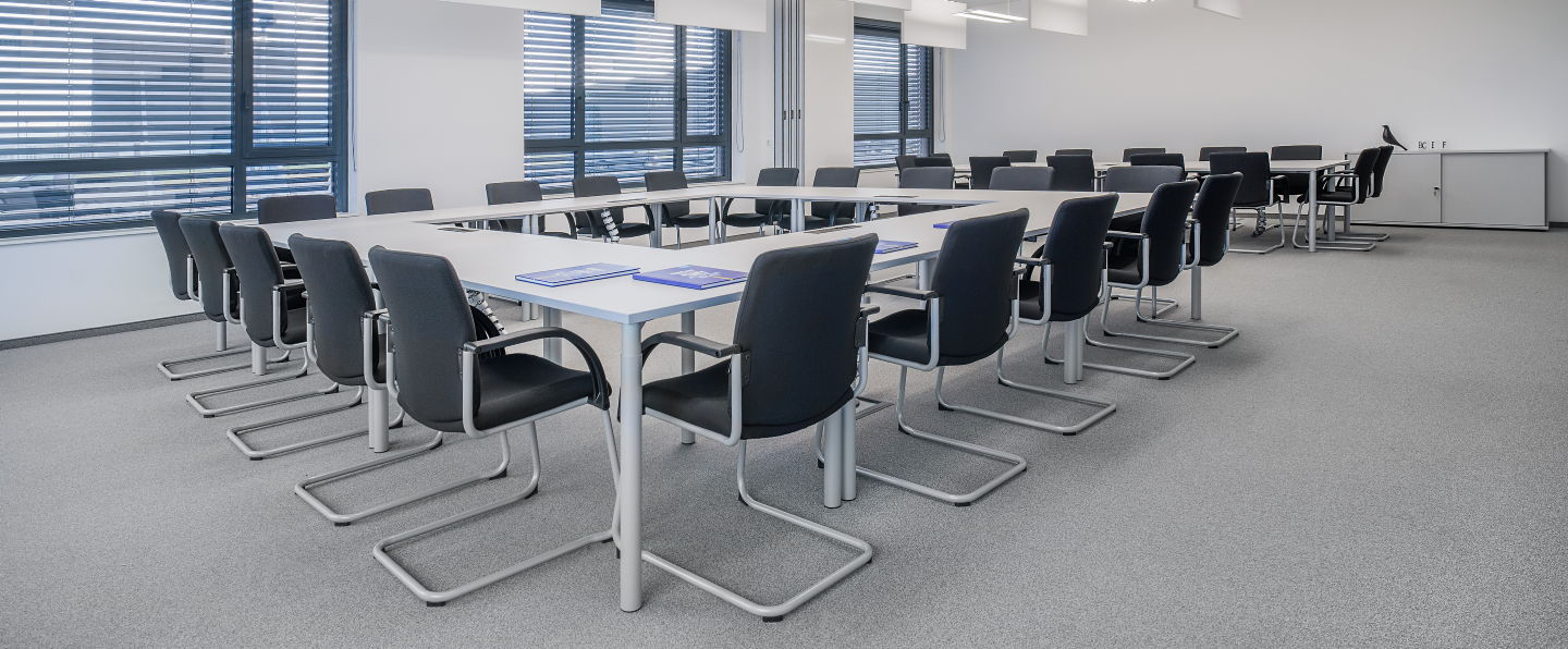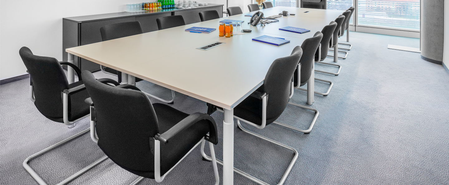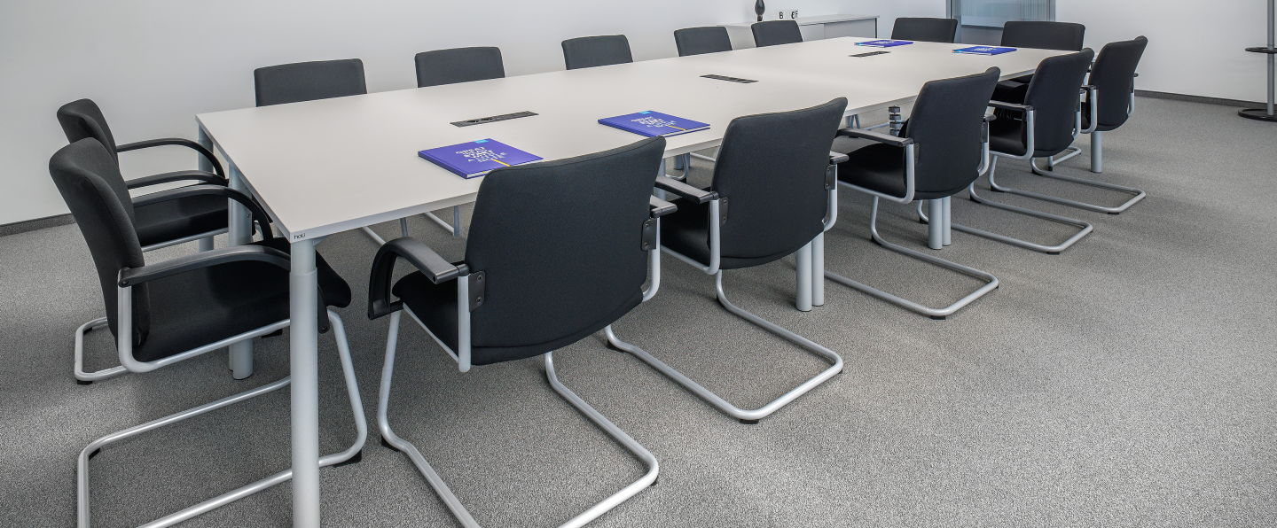 Wähle aus verschiedenen Tischplattenstärken, -größen und Farben – und gestalte so genau den Besprechungsbereich, der zu deinem Unternehmen passt. Kabelklappe oder Medientechnik? Natürlich möglich.