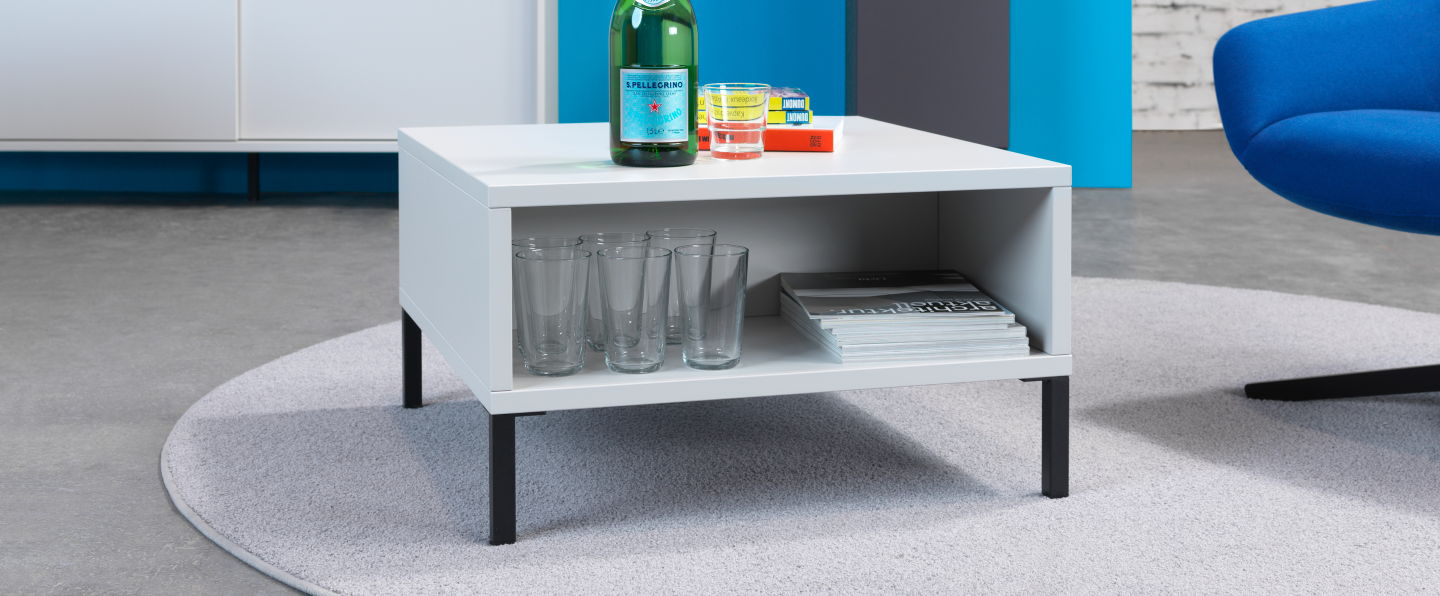 Couchtisch aus 25 mm melaminbeschichteter Feinspanplatte – perfekt als Ablagefläche in Wartezonen oder kleinen Meetingbereichen.