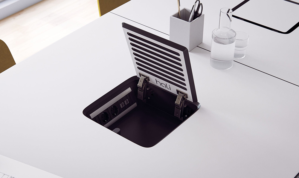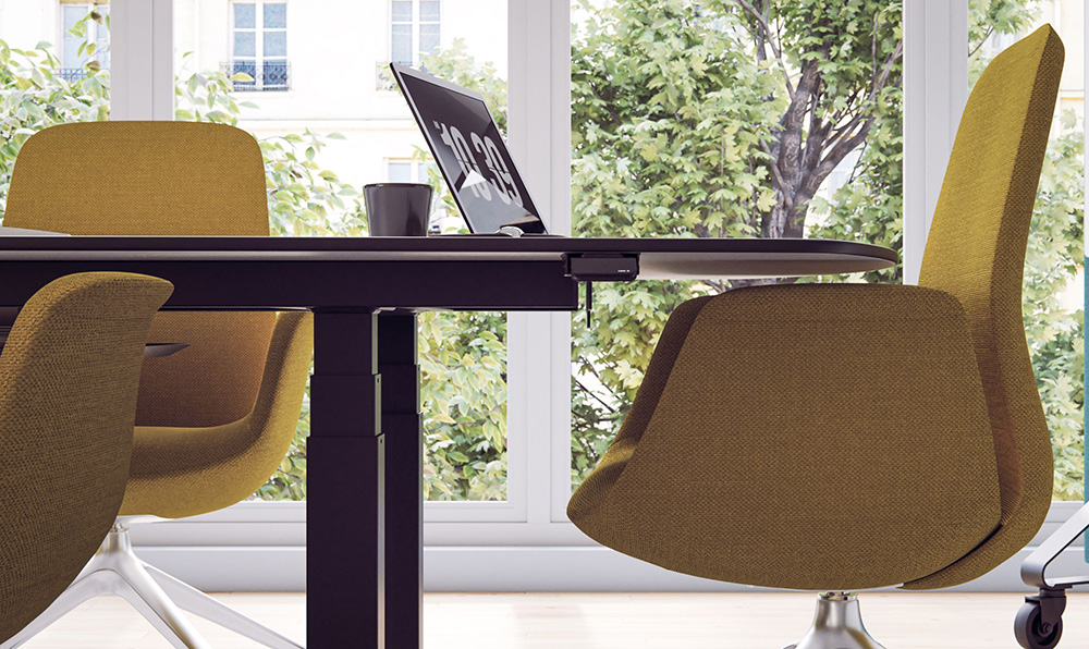 Optionales Kabelmanagement und vielfältige Oberflächenvarianten machen ihn zur smarten Lösung für moderne Arbeitswelten. Die Anti-Kollisionslösung Piezo™ bietet sowohl beim Hochfahren als auch beim Runterfahren Schutz für den elektrisch höhenverstellbaren Tisch und Kollisionsobjekte.