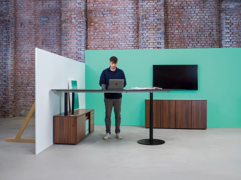 Erhältlich mit runder Bodenplatte und schlanker Säule überzeugt der s570 auch optisch. Soft-Start-Stopp-Funktion und Sicherheitssensor sorgen für ein komfortables und sicheres Nutzererlebnis. Als Rechteck- oder Consultertisch ein echter Allrounder.