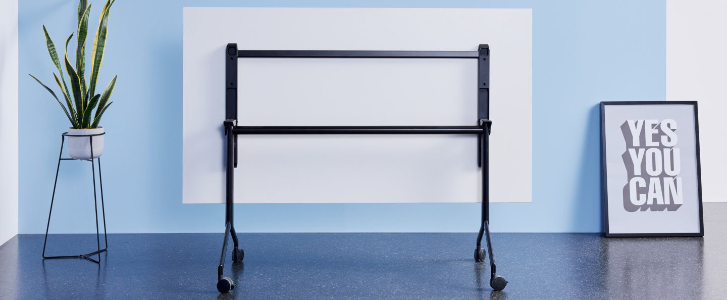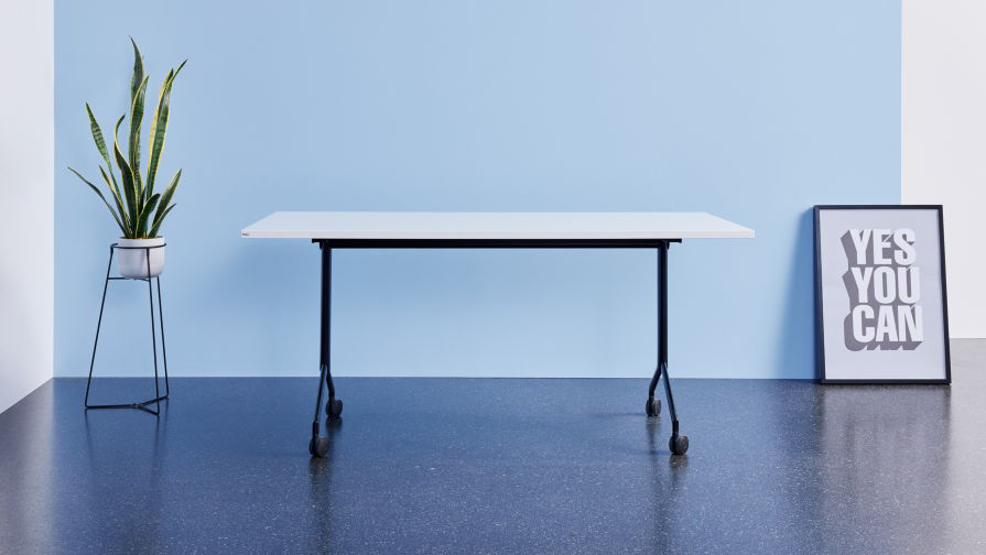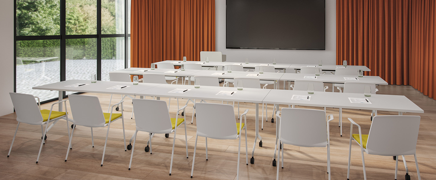 Schwenkbare Tischplatte, praktischer Funktionalität und optionalem Rammschutz – ideal für dynamische, wandelbare Raumnutzung.