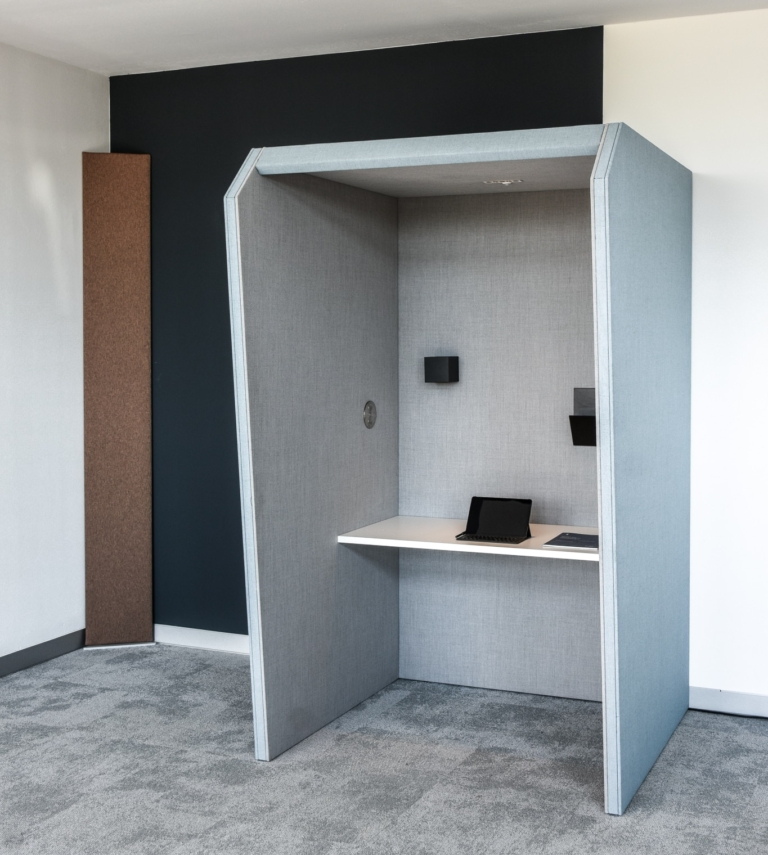 Hybrides Arbeiten braucht eine gute Akustik. Die VideoBooth ist ein offenes Raum-in-Raum-Konzept für spontane Calls und Videokonferenzen. Drei Seiten sind akustisch abgeschirmt, eine Seite bleibt offen. So bleibst du erreichbar, ohne das Umfeld zu stören. Sie lässt sich flexibel in bestehende Flächen integrieren, schafft Privatsphäre für vertrauliche Gespräche und sorgt für klare Kommunikation im hektischen Büroalltag.