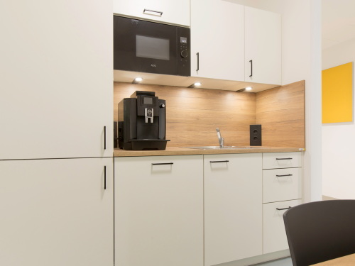 Unser Küchenangebot umfasst nicht nur große Küchenlösungen – wir sind auch Experten darin, für selbst den kleinsten Raum die perfekte Küchenlösung zu kreieren. Unsere Teeküchen sind wahre Raumwunder: In ihnen finden Spüle und Müllsystem, Geschirrspüler, Kühlschrank mit Gefrierfach, Mikrowelle sowie ausreichend Stauraum ihren Platz. Selbst für die Kaffeemaschine ist vorgesorgt. Ein besonderes Detail sind die Wangen, die bis zur Arbeitsplatte reichen, wodurch die Küche auch aus der Seitenansicht stets aufgeräumt wirkt. Ideal für Büros, in denen jeder Quadratmeter zählt.