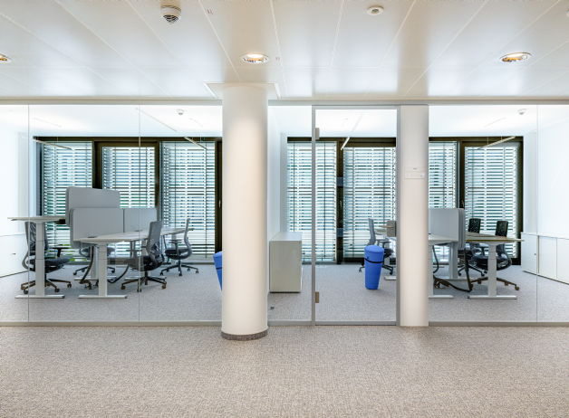Die Büros sind großzügige, helle Arbeitsbereiche, die bewusst flexibel gestaltet wurden. Alle Arbeitsplätze sind mit höhenverstellbaren Tischen ausgestattet, inklusive Untertischladen für Schreibutensilien und Post-its. Fein abgestimmte Akustikelemente schaffen Ruhe, ohne die Offenheit des Raums zu verlieren. Schiebetürschränke auf niedriger Höhe gliedern Zonen, ohne Grenzen zu ziehen. Die klare, übersichtliche Gestaltung der Räume lenkt den Blick auf das Wesentliche: konzentriertes Arbeiten.