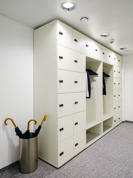 Für die CKV Gruppe entstanden daher auch durchdachte Lösungen jenseits der Office-Zonen: Umkleidebereiche mit Spiegel, Wertfächern und Sitzbank, Sonderanfertigungen für Stauraum und strukturierte Übergangsbereiche.