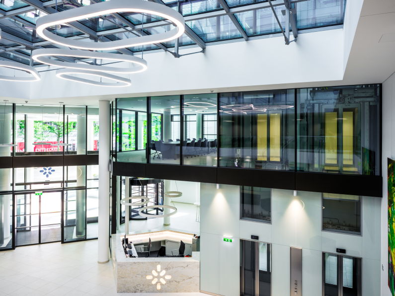 ein Arbeitsumfeld, das moderne Büroarchitektur mit funktionaler Möblierung verbindet.