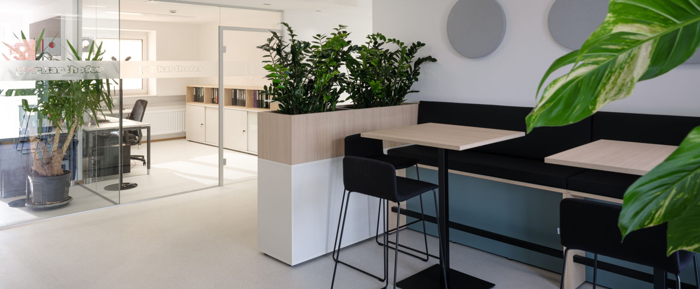 Für die notwendige Trennung von Kommunikationszone und Gang sorgt eine Kombination von Schiebetürenschrank mit Blumenwannen-Aufsatz. Diese bringt zusätzliche Frische in das Raumkonzept und macht die offene Zone, durch die schalldämmende Wirkung der Pflanzen, zu einem angenehmen Treffpunkt für Mitarbeiter*innen.