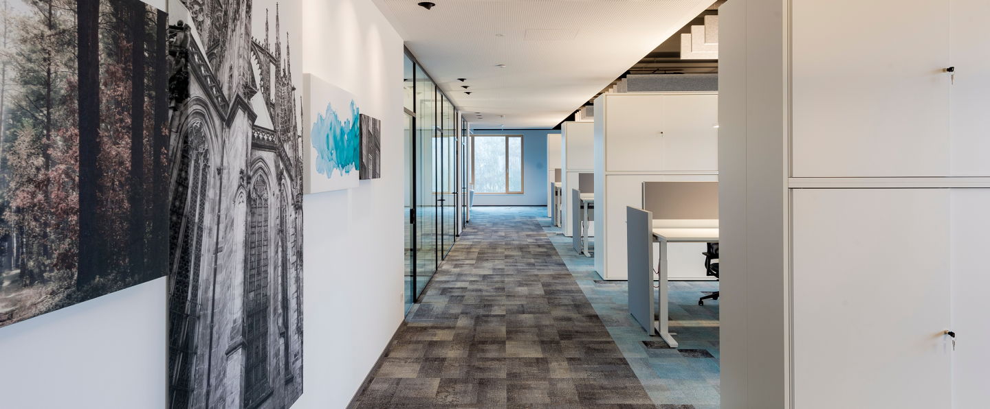 Die offenen Arbeitsräume wurden durch Schiebetürenschränke oder eine Regal-Schiebetürschrank-Kombinationen getrennt. Da es bei vielen Mitarbeiterinnen und Mitarbeitern im selben Raum sehr laut werden kann, wurde zusätzlicher Wert auf Akustik-Paneele gelegt, die –ebenfalls in Weiß gehalten – über den Arbeitsplätzen der Mitarbeitenden von der Decke hängen.