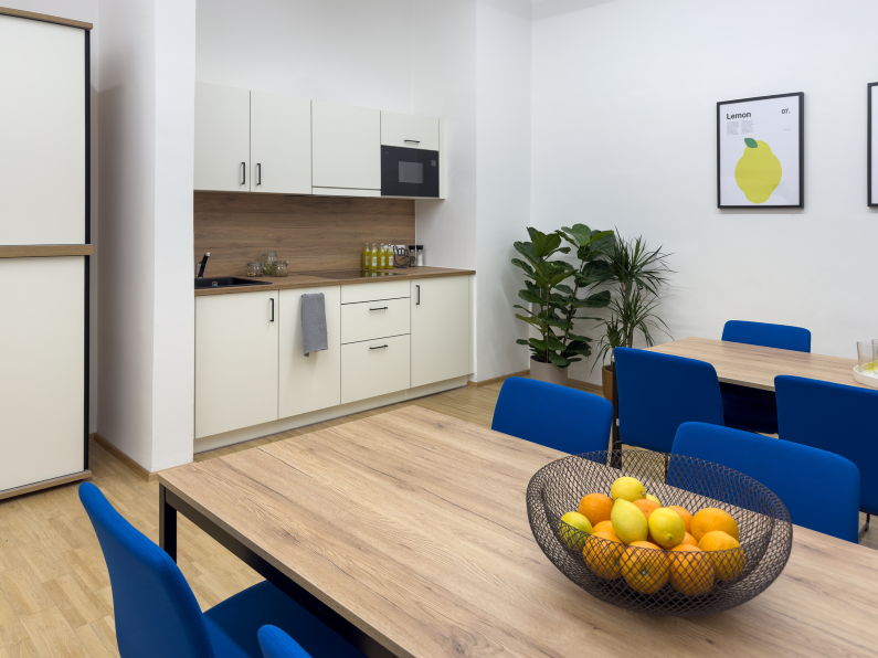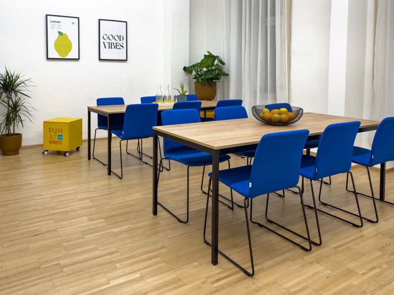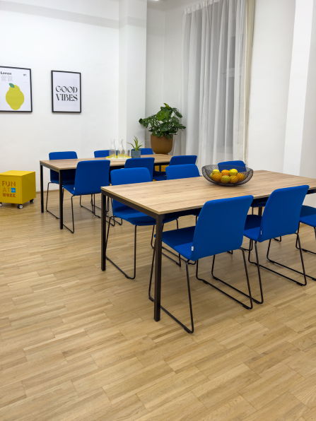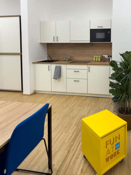 Als verbindendes Element im Büroalltag wurde eine Cafeteria mit Küchenzeile und großzügigen Sitzmöglichkeiten umgesetzt. Die Tische lassen sich je nach Bedarf kombinieren und schaffen Raum für gemeinsame Pausen, informelle Gespräche oder kleinere Teamrunden. Die Büroküche ist bewusst offen und einladend gestaltet – ein Ort, der den sozialen Austausch stärkt und den Arbeitsalltag auflockert.