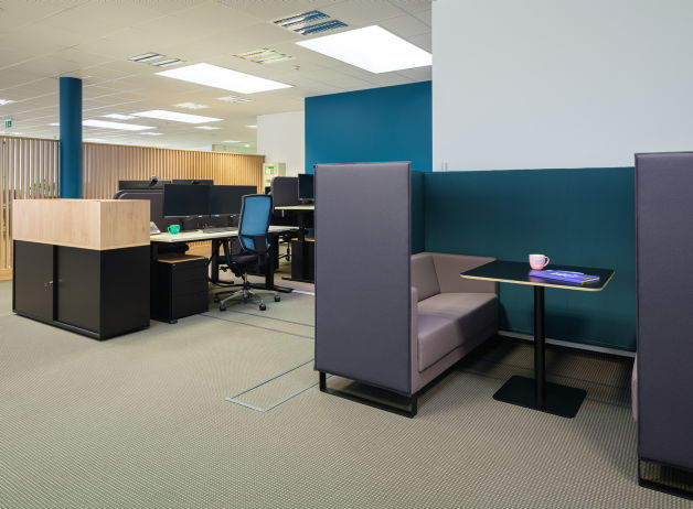 Der zentrale Bestandteil des Projekts ist das neu strukturierte Großraumbüro, in dem 44 Arbeitsplätze realisiert wurden. Zum Einsatz kamen höhenverstellbare Schreibtische in Kombination mit Schiebetürenschränke, die ergonomisches Arbeiten unterstützen und nahtlos in die bestehende Gebäudestruktur einfügen. Platz für für kurze Besprechungen finden die Mitarbeiter*innen in den Besprechungs-Lounges Vancouver von Profim.
