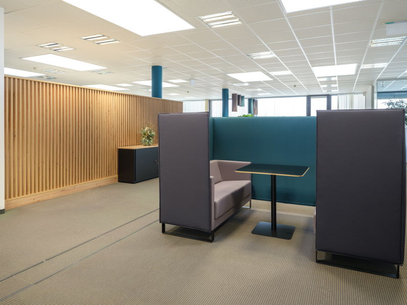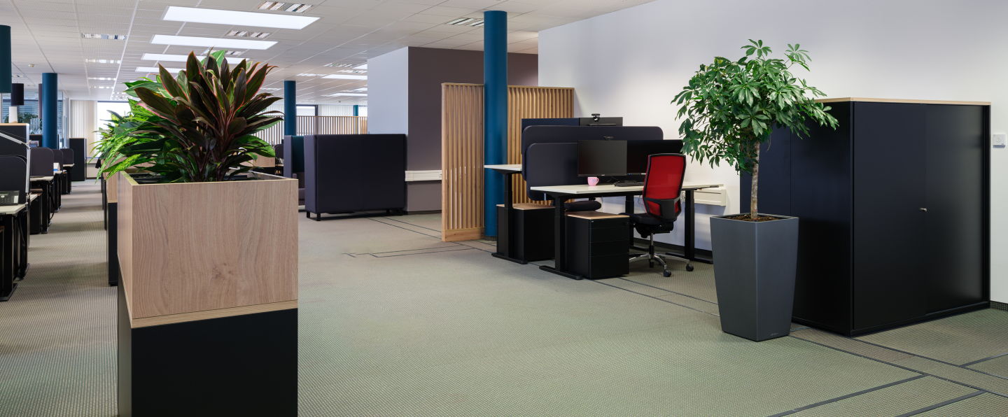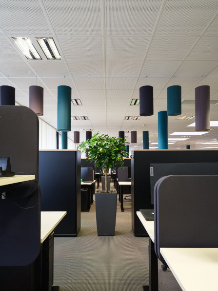 Zur Gliederung der offenen Fläche und zur Verbesserung des Raumklimas wurden Blumenwannen Evergreen integriert. Sie dienen sowohl als gestalterisches Element als auch zur natürlichen Zonierung des Großraumbüros. Ergänzend sorgen von der Decke hängende Zylinder für eine gezielte akustische Optimierung und tragen dazu bei, die Geräuschkulisse im offenen Arbeitsumfeld zu reduzieren.