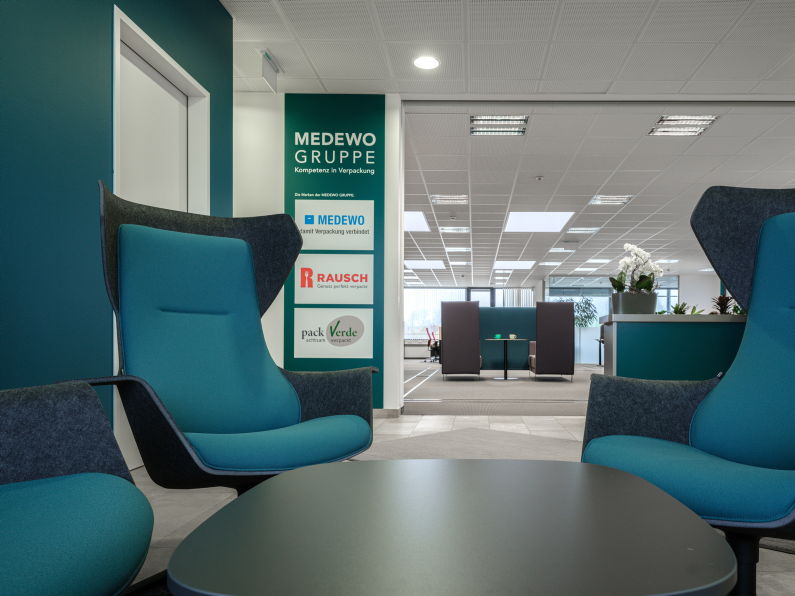Im Eingangsbereich wurde eine Loungezone geschaffen, die als Empfangs- und Aufenthaltsbereich dient. Mit den bequemen Sitzmöbeln entstand ein ruhiger, klar definierter Bereich für kurze Besprechungen, informelle Gespräche oder Wartezeiten. Die Möblierung fügt sich harmonisch in das Gesamtkonzept ein und unterstreicht den repräsentativen Charakter der Eingangszone.