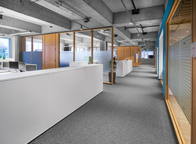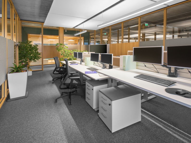 In Abstimmung mit dem projektleitenden Architekten füllten unsere Büromöbel Schritt für Schritt diese luftigen Räumlichkeiten und bieten nun Platz für rund 300 Mitarbeiter*innen. Mit modernen Sitz-Steh-Tischen für einen ergonomischen Ausgleich und Rollcontainern mit Sitzauflage für kurze Gespräche zwischen Kolleginnen und Kollegen, bringen die Arbeitsplätze Abwechslung in den Alltag. Praktische Sichtschutz-Paneele zwischen den gegenüberliegenden Tischen bieten Platz für Notizen und zusätzliche Organisationselemente.