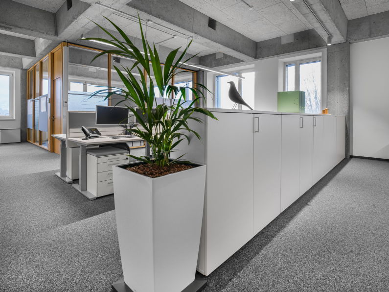 In den offenen Bereichen dienen Drehtürenschränke als Stauraum für Unterlagen und weitere Büromaterialien. Gleichzeitig werden diese auch geschickt als Trennelemente zwischen den einzelnen Arbeitsbereichen eingesetzt.