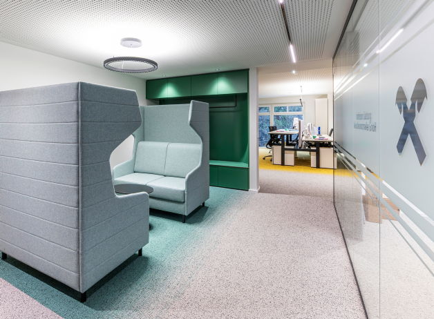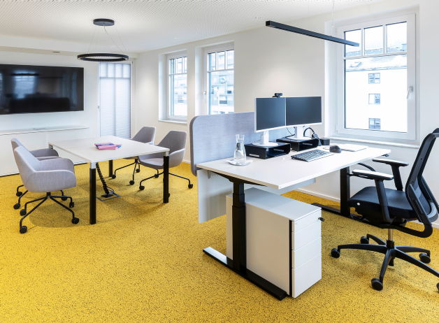 Die Open-Office-Bereiche sind klar gegliedert und auf effizientes Teamwork ausgelegt. Die ergonomische Sitz-Steh-Tische ermöglichen flexibles Arbeiten und fördern Bewegung im Arbeitsalltag. Für Rückzug und konzentrierte Gespräche sorgen die Besprechungskojen Framery, die akustische Ruhe in der offenen Struktur schaffen und so die Arbeitsqualität erhöhen.