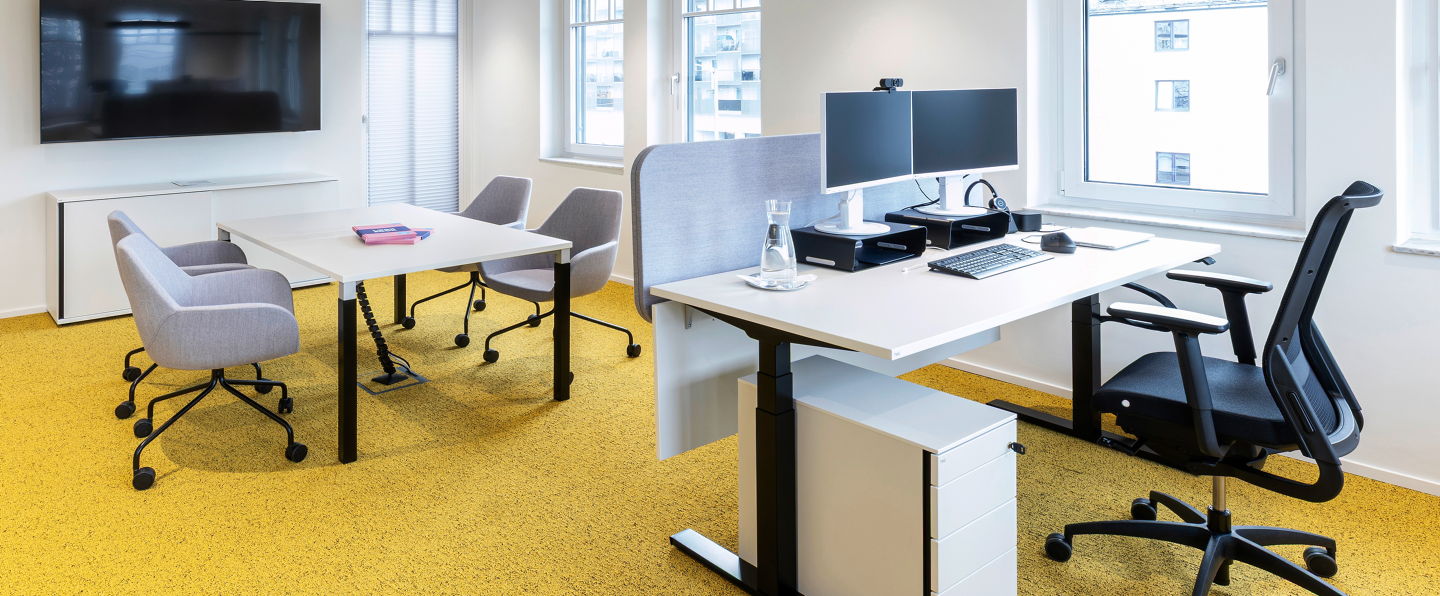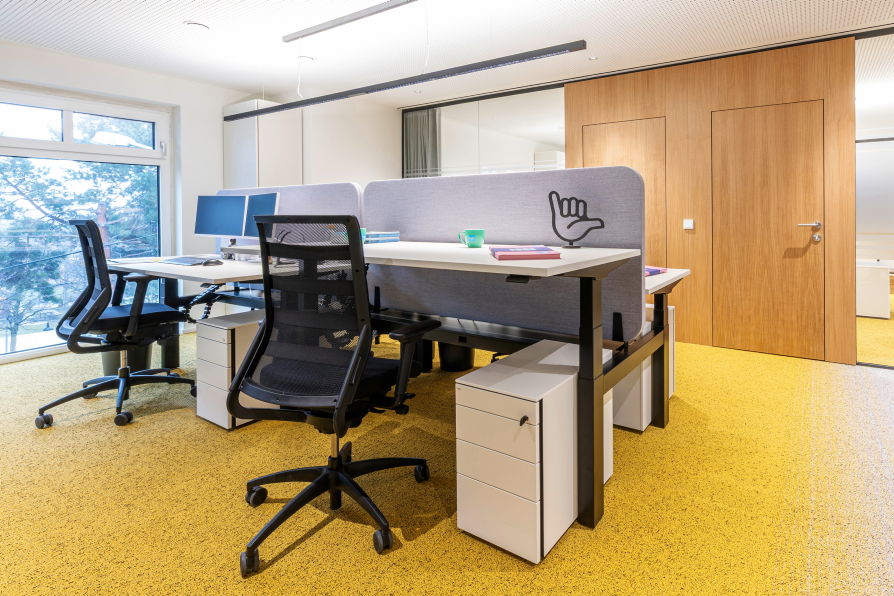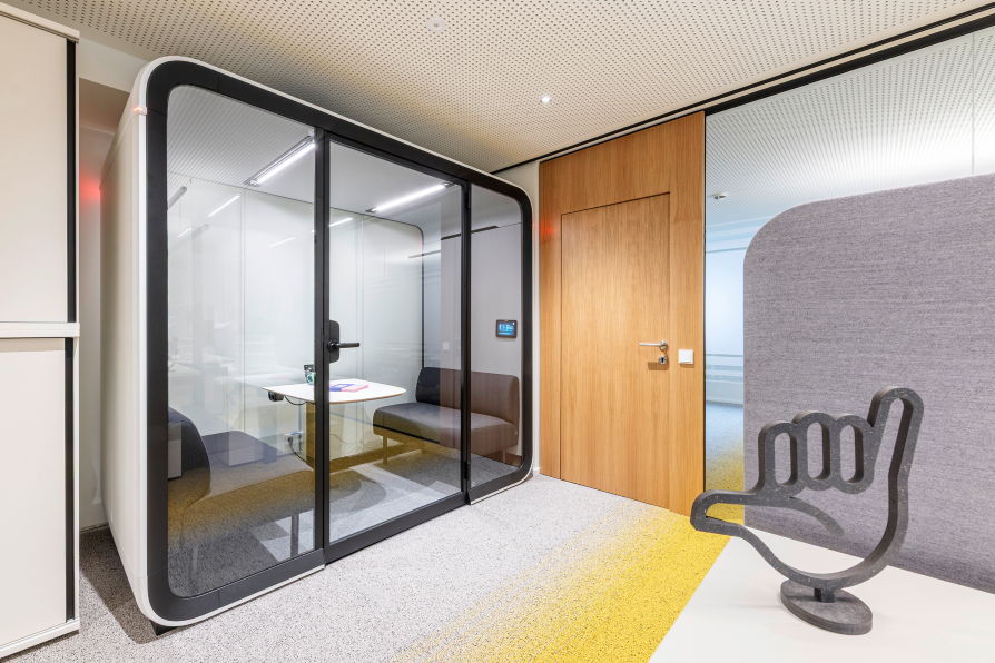 Die Open-Office-Bereiche sind klar gegliedert und auf effizientes Teamwork ausgelegt. Die ergonomische Sitz-Steh-Tische ermöglichen flexibles Arbeiten und fördern Bewegung im Arbeitsalltag. Für Rückzug und konzentrierte Gespräche sorgen die Besprechungskojen Framery, die akustische Ruhe in der offenen Struktur schaffen und so die Arbeitsqualität erhöhen.