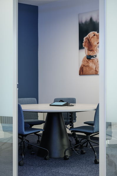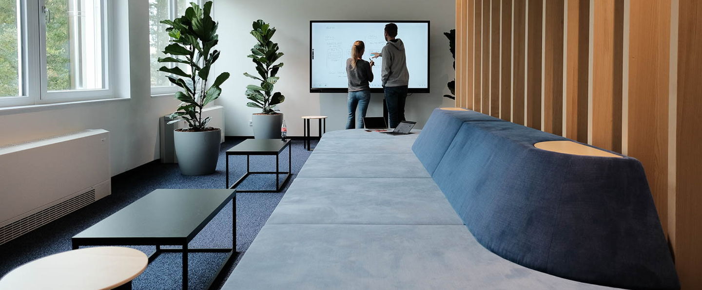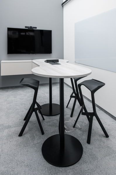 Die etwas kleineren Räume beinhalten einerseits Rundtische und dazu Stühle mit Rollen und andererseits Stehtische mit Barhockern. Dadurch ist auch hier eine möglichst hohe Flexibilität gegeben. Technisch sind alle sieben Räume auf dem neuesten Stand. Überall sind Bildschirme für Videokonferenzen und Präsentationen zu finden. Die Anschlüsse sind in versenkten Docking Stations verbaut. So ist in jedem Raum garantiert, dass die Meetings reibungslos ablaufen können.